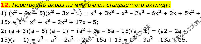 Перетворіть вираз на многочлен стандартного вигляду: 1) (х2 – 2х + 5)(х2 + 3х – 1) = x4 + 3х3 – x2 – 2х3 – 6х2 + 2х + 5х2 + 15х – 5 = x4 + x3 – 2x2 + 17x – 5; 2) (а + 3)(а – 5) (а – 1) = (а2 + 3а – 5а – 15)(а – 1) = (а2 – 2а – 15)(а – 1) = а3 – а2 – 2а2 + 2а – 15а + 15 = а3 – 3а2 – 13а + 15.