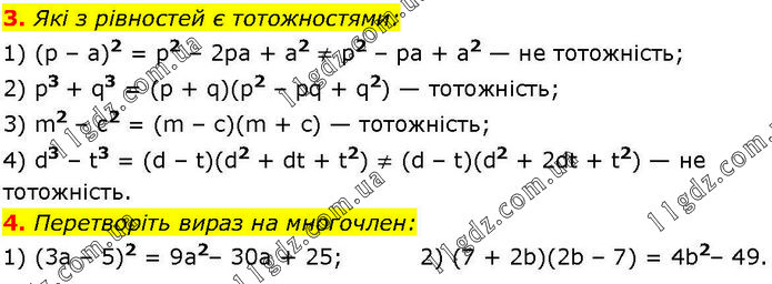 3. Які з рівностей є тотожностями: 1) (р – а)2 = р2 – 2ра + a2 ≠ p2 – ра + а2 — не тотожність; 2) р3 + q3 = (p + q)(p2 – pq + q2) — тотожність; 3) m2 – c2 = (m – с)(m + с) — тотожність; 4) d3 – t3 = (d – t)(d2 + dt + t2) ≠ (d – t)(d2 + 2dt + t2) — не тотожність. 4. Перетворіть вираз на многочлен: 1) (3а – 5)2 = 9a2– 30а + 25; 2) (7 + 2b)(2b – 7) = 4b2– 49.