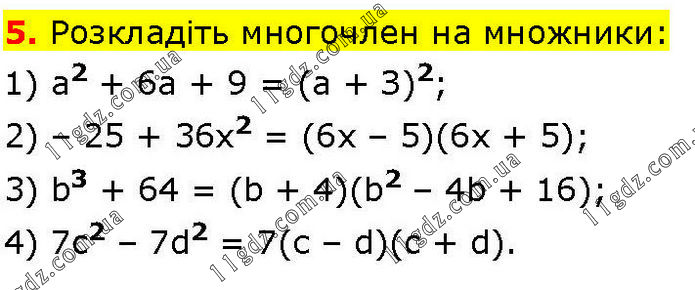 Розкладіть многочлен на множники: 1) а2 + 6а + 9 = (а + З)2; 2) – 25 + 36х2 = (6х – 5)(6х + 5); 3) b3 + 64 = (b + 4)(b2 – 4b + 16); 4) 7c2 – 7d2 = 7(с – d)(c + d).