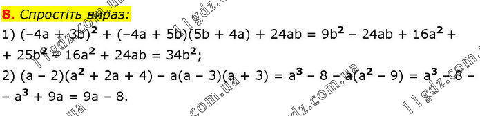Спростіть вираз: 1) (–4а + 3b)2 + (–4а + 5b)(5b + 4а) + 24аb = 9b2 – 24аb + 16а2 + + 25b2 – 16а2 + 24аb = 34b2; 2) (а – 2)(а2 + 2а + 4) – а(а – 3)(а + 3) = а3 – 8 – а(а2 – 9) = а3 – 8 – – а3 + 9а = 9а – 8.