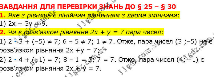 ЗАВДАННЯ ДЛЯ ПЕРЕВІРКИ ЗНАНЬ ДО § 25 – § 30 1. Яке з рівнянь є лінійним рівнянням з двома змінними: 1) 2х + 3у = 9. 2. Чи є розв’язком рівняння 2х + у = 7 пара чисел: 1) 2 ∙ 3 + (–5) ≠ 7; 6 – 5 ≠ 7; 1 ≠ 7. Отже, пара чисел (3 ;–5) не є розв’язком рівняння 2х +у = 7; 2) 2 ∙ 4 + (–1) = 7; 8 – 1 = 7; 7 = 7. Отже, пара чисел (4; –1) є розв’язком рівняння 2х + у = 7.