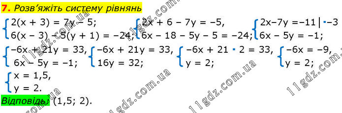 Розв’яжіть систему рівнянь 2(x + 3) = 7y – 5; 2x + 6 – 7y = –5, 2x–7y =–11│∙–3 6(x – 3) – 5(y + 1) = –24; 6x – 18 – 5y – 5 = –24; 6x – 5y = –1; –6x + 21y = 33, –6x + 21y = 33, –6x + 21 ∙ 2 = 33, –6x = –9, 6x – 5y = –1; 16y = 32; y = 2; y = 2; x = 1,5, y = 2. Відповідь: (1,5; 2).