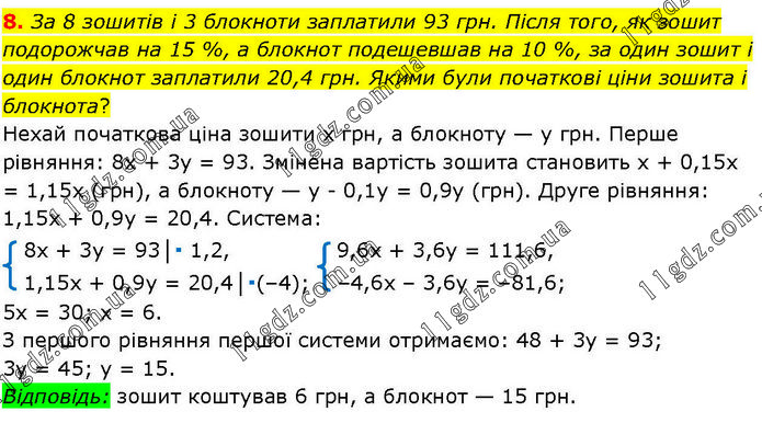 За 8 зошитів і 3 блокноти заплатили 93 грн. Після того, як зошит подорожчав на 15 %, а блокнот подешевшав на 10 %, за один зошит і один блокнот заплатили 20,4 грн. Якими були початкові ціни зошита і блокнота? Нехай початкова ціна зошити х грн, а блокноту — у грн. Перше рівняння: 8х + 3у = 93. Змінена вартість зошита становить х + 0,15х = 1,15х (грн), а блокноту — y - 0,1y = 0,9y (грн). Друге рівняння: 1,15х + 0,9y = 20,4. Система: 8x + 3y = 93│∙ 1,2, 9,6x + 3,6y = 111,6, 1,15x + 0,9y = 20,4│∙(–4); –4,6x – 3,6y = –81,6; 5x = 30; х = 6. З першого рівняння першої системи отримаємо: 48 + 3у = 93; 3y = 45; у = 15. Відповідь: зошит коштував 6 грн, а блокнот — 15 грн.
