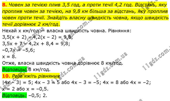8. Човен за течією плив 3,5 год, а проти течії 4,2 год. Відстань, яку проплив човен за течією, на 9,8 км більша за відстань, яку проплив човен проти течії. Знайдіть власну швидкість човна, якщо швидкість течії дорівнює 2 км/год. Нехай х км/год — власна швидкість човна. Рівняння: 3,5(х + 2) – 4,2(х – 2) = 9,8; 3,5х + 7 – 4,2х + 8,4 = 9,8; –0,7х = –5,6; х = 8. Отже, власна швидкість човна дорівнює 8 км/год. Відповідь: 8 км/год. 10. Розв’яжіть рівняння |4х – 3| = 5; 4х – 3 = 5 або 4х – 3 = –5; 4х = 8 або 4х = –2; х = 2 або х = –0,5. Відповідь: –0,5; 2.