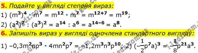 5. Подайте у вигляді степеня вираз: 1) (m3)4 ∙ m7 = m12 ∙ m7 = m12+7 = m19; 2) (а2)7 : (а3)2 = а14 : а6 = а14–6 = а8. 6. Запишіть вираз у вигляді одночлена стандартного вигляду: 1) –0,3m2np3 ∙ 4mn2p7 = –1,2m3n3p10; 2) (–1/2p7a)3 = –1/8p21a3.