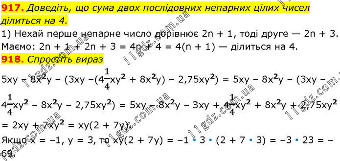 917. Доведіть, що сума двох послідовних непарних цілих чисел ділиться на 4. 1) Нехай перше непарне число дорівнює 2n + 1, тоді друге — 2n + 3. Маємо: 2n + 1 + 2n + 3 = 4n + 4 = 4(n + 1) — ділиться на 4. 918. Спростіть вираз 5xy – 8х2y – (3ху –(41/4ху2 + 8х2у) – 2,75xy2) = 5ху – 8х2у – (3ху – 41/4ху2 – 8х2у – 2,75xу2) = 5xy – 8х2у – Зху + 41/4ху2 + 8x2y + 2,75ху2 = 2xy + 7ху2 = ху(2 + 7у). Якщо х = –1, у = 3, то ху(2 + 7у) = –1 ∙ 3 ∙ (2 + 7 ∙ 3) = –3 ∙ 23 = –69.