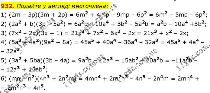 Подайте у вигляді многочлена: 1) (2m – 3р)(3m + 2р) = 6m2 + 4mр – 9mр – 6р2 = 6m2 – 5mр – 6р2; 2) (2а2 + b)(3b – 5а2) = 6а2b – 10a4 + Зb2 – 5а2b = a2b – 10a4 +Зb2; 3) (7х2 – 2х)(3х + 1) = 21х3 + 7x2 – 6х2 – 2х = 21х3 + х2 – 2х; 4) (5a3 – 4a2)(9a2 + 8а) = 45а5 + 40а4 – 36а4 – З2а3 = 45а5 + 4а4 – З2а3; 5) (3а2 + 5ba)(3b – 4а) = 9а2b – 12а3 + 15ab2 – 20а2b = –11a2b – 12а3 + 15аb2; 6) (mn – n2)(4n3 + 2n2m) = 4mn4 + 2m2n3 – 4n5 – 2n4m = 2mn4 + 2m2n3 – 4n5.