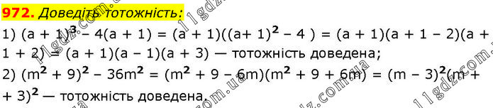 Доведіть тотожність: 1) (а + 1)3 – 4(а + 1) = (а + 1)((а+ 1)2 – 4 ) = (а + 1)(а + 1 – 2)(а + 1 + 2) = (а + 1)(а – 1)(а + 3) — тотожність доведена; 2) (m2 + 9)2 – 36m2 = (m2 + 9 – 6m)(m2 + 9 + 6m) = (m – 3)2(m + З)2 — тотожність доведена.