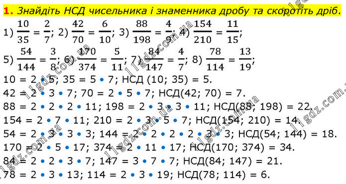 3найдiть НСД чисельника i знаменника дробу та скоротiть дрiб. 1) 10/35 = 2/7; 2) 42/70 = 6/10; 3) 88/198 = 4/9; 4) 154/210 = 11/15; 5) 54/144 = 3/8; 6) 170/374 = 5/11; 7) 84/147 = 4/7; 8) 78/114 = 13/19; 10 = 2 • 5; 35 = 5 • 7; НСД (10; 35) = 5. 42 = 2 • 3 • 7; 70 = 2 • 5 • 7; НСД(42; 70) = 7. 88 = 2 • 2 • 2 • 11; 198 = 2 • 3 • 3 • 11; НСД(88; 198) = 22. 154 = 2 • 7 • 11; 210 = 2 • 3 • 5 • 7; НСД(154; 210) = 14. 54 = 2 • 3 • 3 • 3; 144 = 2 • 2 • 2 • 2 • 3 • 3; НСД(54; 144) = 18. 170 = 2 • 5 • 17; 374 = 2 • 11 • 17; НСД(170; 374) = 34. 84 = 2 • 2 • 3 • 7; 147 = 3 • 7 • 7; НСД(84; 147) = 21. 78 = 2 • 3 • 13; 114 = 2 • 3 • 19; НСД(78; 114) = 6.