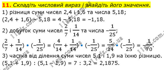 Складіть числовий вираз і знайдіть його значення. 1) різниця суми чисел 2,4 і 1,6 та числа 5,18; (2,4 + 1,6) – 5,18 = 4 – 5,18 = –1,18. 2) добуток суми чисел 2/7 і 1/14 та числа –1/25; (2/7 + 1/14) • (–1/25) = (4/14 + 1/14) • (–1/25) = 5/14 • (–1/25) = –1/70. 3) частка від ділення суми чисел 5,1 і 1,9 на їхню різницю. (5,1 + 1,9) : (5,1 – 1,9) = 7 : 3,2 = 2,1875.