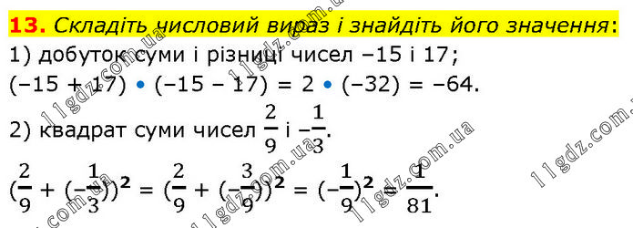 Складіть числовий вираз і знайдіть його значення: 1) добуток суми і різниці чисел –15 і 17; (–15 + 17) • (–15 – 17) = 2 • (–32) = –64. 2) квадрат суми чисел 2/9 і –1/3. (2/9 + (–1/3))2 = (2/9 + (–3/9))2 = (–1/9)2 = 1/81.