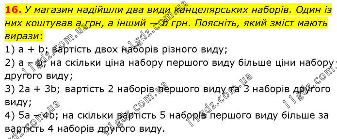 У магазин надійшли два види канцелярських наборів. Один із них коштував а грн, а інший — b грн. Поясніть, який зміст мають вирази: 1) a + b; вартість двох наборів різного виду; 2) a – b; на скільки ціна набору першого виду більше ціни набору другого виду; 3) 2а + 3b; вартість 2 наборів першого виду та 3 наборів другого виду; 4) 5а – 4b; на скільки вартість 5 наборів першого виду більше за вартість 4 наборів другого виду.