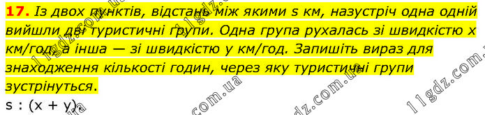 Із двох пунктів, відстань між якими s км, назустріч одна одній вийшли дві туристичні групи. Одна група рухалась зі швидкістю х км/год, а інша — зі швидкістю у км/год. Запишіть вираз для знаходження кількості годин, через яку туристичні групи зустрінуться. s : (x + y).