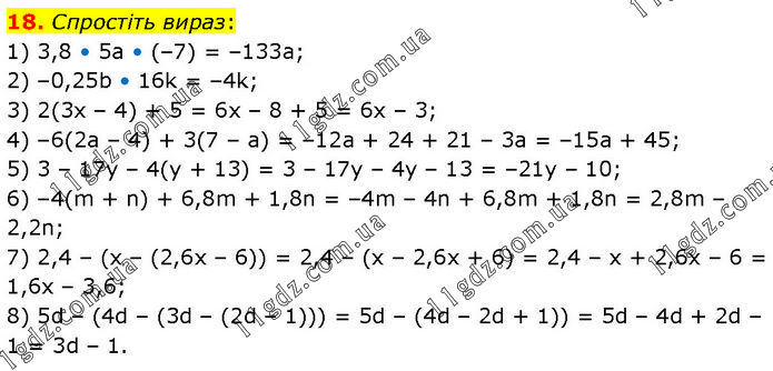 Спростіть вираз: 1) 3,8 • 5а • (–7) = –133a; 2) –0,25b • 16k = –4k; 3) 2(3x – 4) + 5 = 6x – 8 + 5 = 6x – 3; 4) –6(2а – 4) + 3(7 – а) = –12a + 24 + 21 – 3a = –15a + 45; 5) 3 – 17у – 4(у + 13) = 3 – 17y – 4y – 13 = –21y – 10; 6) –4(m + n) + 6,8m + 1,8n = –4m – 4n + 6,8m + 1,8n = 2,8m – 2,2n; 7) 2,4 – (х – (2,6x – 6)) = 2,4 – (x – 2,6x + 6) = 2,4 – x + 2,6x – 6 = 1,6x – 3,6; 8) 5d – (4d – (3d – (2d – 1))) = 5d – (4d – 2d + 1)) = 5d – 4d + 2d – 1 = 3d – 1.