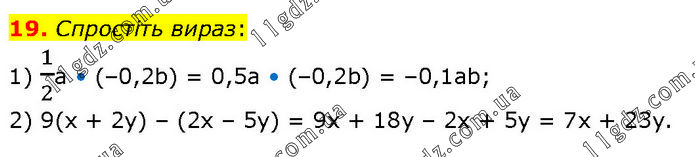 Спростіть вираз: 1) 1/2а • (–0,2b) = 0,5a • (–0,2b) = –0,1ab; 2) 9(x + 2у) – (2х – 5у) = 9x + 18y – 2x + 5y = 7x + 23y.