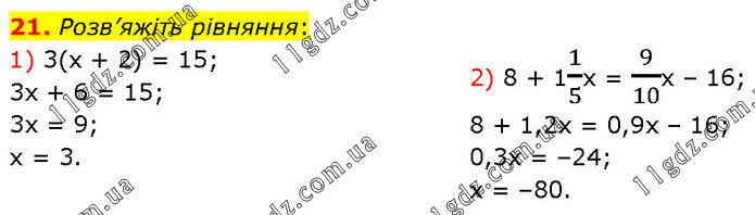 Розв’яжіть рівняння: 1) 3(х + 2) = 15; 3х + 6 = 15; 3х = 9; х = 3. 2) 8 + 11/5х = 9/10х – 16; 8 + 1,2х = 0,9х – 16; 0,3х = –24; х = –80.
