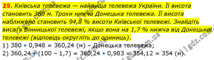 Київська телевежа — найвища телевежа України. Її висота становить 380 м. Трохи нижча Донецька телевежа. Її висота наближено становить 94,8 % висоти Київської телевежі. Знайдіть висоту Вінницької телевежі, якщо вона на 1,7 % нижча від Донецької телевежі (відповідь округліть до одиниць). 1) 380 • 0,948 = 360,24 (м) – Донецька телевежа; 2) 360,24 • (100 – 1,7) = 360,24 • 0,983 = 354,12 = 354 (м).