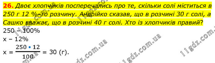 Двоє хлопчиків посперечались про те, скільки солі міститься в 250 г 12 %–го розчину. Андрійко сказав, що в розчині 30 г солі, а Сашко вважає, що в розчині 40 г солі. Хто із хлопчиків правий? 250 – 100% х – 12% х = (250 • 12)/100 = 30 (г).