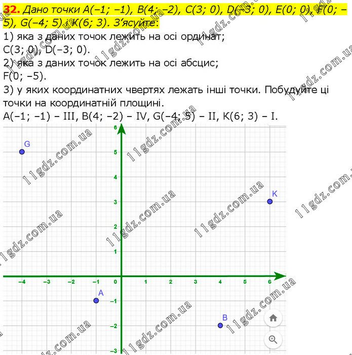 Дано точки А(–1; –1), В(4; –2), С(3; 0), D(–3; 0), E(0; 0), F(0; –5), G(–4; 5) і К(6; 3). З’ясуйте: 1) яка з даних точок лежить на осі ординат; С(3; 0), D(–3; 0). 2) яка з даних точок лежить на осі абсцис; F(0; –5). 3) у яких координатних чвертях лежать інші точки. Побудуйте ці точки на координатній площині. А(–1; –1) – III, В(4; –2) – IV, G(–4; 5) – II, К(6; 3) – I.