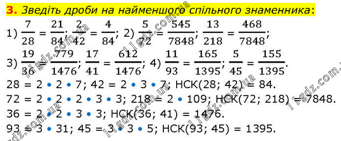 3ведiть дроби на найменшого спiльного знаменника: 1) 7/28 = 21/84; 2/42 = 4/84; 2) 5/72 = 545/7848; 13/218 = 468/7848; 3) 19/36 = 779/1476; 17/41 = 612/1476; 4) 11/93 = 165/1395; 5/45 = 155/1395. 28 = 2 • 2 • 7; 42 = 2 • 3 • 7; НСК(28; 42) = 84. 72 = 2 • 2 • 2 • 3 • 3; 218 = 2 • 109; НСК(72; 218) = 7848. 36 = 2 • 2 • 3 • 3; НСК(36; 41) = 1476. 93 = 3 • 31; 45 = 3 • 3 • 5; НСК(93; 45) = 1395.