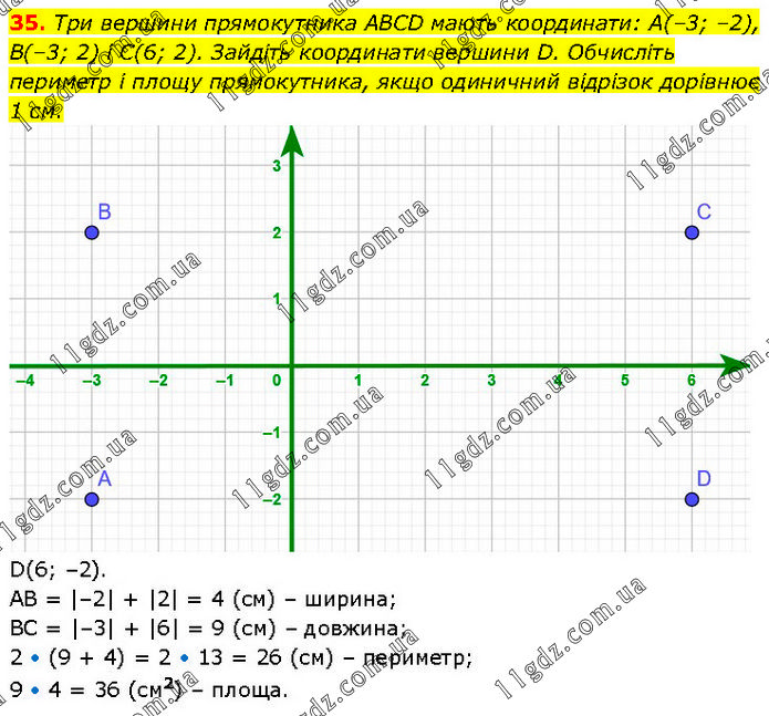 Три вершини прямокутника ABCD мають координати: А(–3; –2), В(–3; 2) і С(6; 2). Зайдіть координати вершини D. Обчисліть периметр і площу прямокутника, якщо одиничний відрізок дорівнює 1 см. D(6; –2). АВ = |–2| + |2| = 4 (см) – ширина; ВС = |–3| + |6| = 9 (см) – довжина; 2 • (9 + 4) = 2 • 13 = 26 (см) – периметр; 9 • 4 = 36 (см2) – площа.