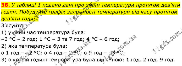 У таблиці 1 подано дані про зміни температури протягом дев’яти годин. Побудуйте графік залежності температури від часу протягом дев’яти годин. З’ясуйте: 1) у який час температура була: –2 °С – 2 год; 1 °С – 3 та 7 год; 4 °С – 6 год; 2) яка температура була: о 1 год – –2 °С; о 4 год – 2 °С; о 9 год – –3 °С; 3) о котрій годині температура була від’ємною: 1 год, 2 год, 9 год.