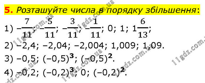 Розташуйте числа в порядку збiльшення: 1) –7/11; –5/11; –3/11; –1/11; 0; 1; 16/13; 2) –2,4; –2,04; –2,004; 1,009; 1,09. 3) –0,5; (–0,5)3; (–0,5)2. 4) –0,2; (–0,2)3; 0; (–0,2)2.