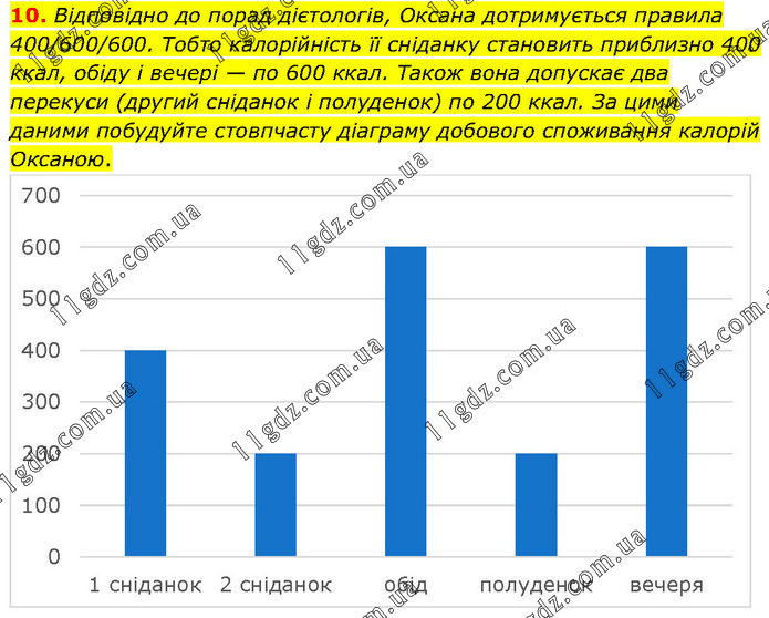 Відповідно до порад дієтологів, Оксана дотримується правила 400/600/600. Тобто калорійність її сніданку становить приблизно 400 ккал, обіду і вечері — по 600 ккал. Також вона допускає два перекуси (другий сніданок і полуденок) по 200 ккал. За цими даними побудуйте стовпчасту діаграму добового споживання калорій Оксаною.