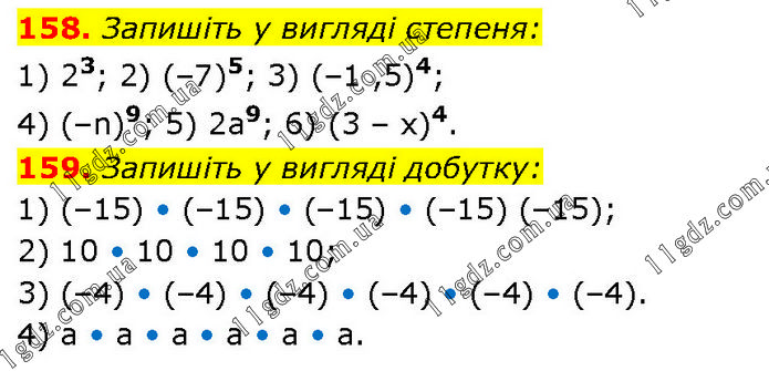 158. Запишіть у вигляді степеня: 1) 23; 2) (–7)5; 3) (–1 ,5)4; 4) (–n)9; 5) 2a9; 6) (3 – x)4. 159. Запишіть у вигляді добутку: 1) (–15) • (–15) • (–15) • (–15) (–15); 2) 10 • 10 • 10 • 10; 3) (–4) • (–4) • (–4) • (–4) • (–4) • (–4). 4) а • а • а • а • а • а.