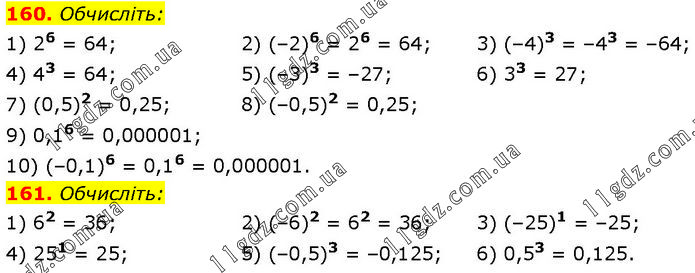 160. Обчисліть: 1) 26 = 64; 4) 43 = 64; 7) (0,5)2 = 0,25; 2) (–2)6 = 26 = 64; 5) (–3)3 = –27; 8) (–0,5)2 = 0,25; 3) (–4)3 = –43 = –64; 6) 33 = 27; 9) 0,16 = 0,000001; 10) (–0,1)6 = 0,16 = 0,000001. 161. Обчисліть: 1) 62 = 36; 4) 251 = 25; 2) (–6)2 = 62 = 36; 5) (–0,5)3 = –0,125; 3) (–25)1 = –25; 6) 0,53 = 0,125.