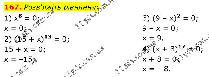 Розв'яжіть рівняння: 1) x8 = 0; х = 0; 2) (15 + x)13 = 0; 15 + x = 0; х = –15; 3) (9 – х)2 = 0; 9 – x = 0; x = 9. 4) (x + 8)17 = 0; x + 8 = 0; x = – 8.