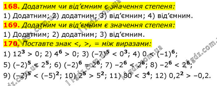 168. Додатним чи від’ємним є значення степеня: 1) Додатним; 2) додатним; 3) від’ємним; 4) від’ємним. 169. Додатним чи від’ємним є значення степеня: 1) Додатним; 2) додатним; 3) від’ємним. 170. Поставте знак <, >, = між виразами: 1) 123 > 0; 2) 46 > 0; 3) (–7)5 < 03; 4) 0 < (–1)6; 5) (–2)5 < 25; 6) (–2)6 = 26; 7) –26 < 26; 8) –26 < 26; 9) (–2)5 < (–5)2; 10) 25 > 52; 11) 80 < 34; 12) 0,22 > –0,2.