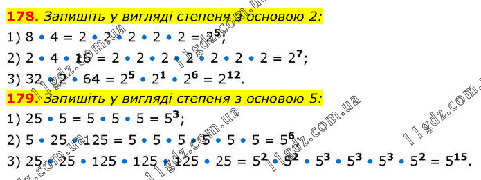 178. Запишіть у вигляді степеня з основою 2: 1) 8 • 4 = 2 • 2 • 2 • 2 • 2 = 25; 2) 2 • 4 • 16 = 2 • 2 • 2 • 2 • 2 • 2 • 2 = 27; 3) 32 • 2 • 64 = 25 • 21 • 26 = 212. 179. Запишіть у вигляді степеня з основою 5: 1) 25 • 5 = 5 • 5 • 5 = 53; 2) 5 • 25 • 125 = 5 • 5 • 5 • 5 • 5 • 5 = 56; 3) 25 • 25 • 125 • 125 • 125 • 25 = 52 • 52 • 53 • 53 • 53 • 52 = 515.