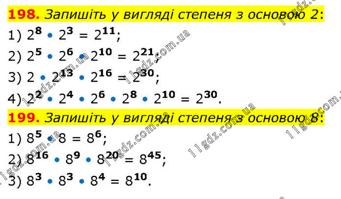 198. Запишіть у вигляді степеня з основою 2: 1) 28 • 23 = 211; 2) 25 • 26 • 210 = 221; 3) 2 • 213 • 216 = 230; 4) 22 • 24 • 26 • 28 • 210 = 230. 199. Запишіть у вигляді степеня з основою 8: 1) 85 • 8 = 86; 2) 816 • 89 • 820 = 845; 3) 83 • 83 • 84 = 810.