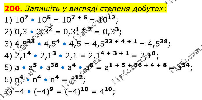 Запишіть у вигляді степеня добуток: 1) 107 • 105 = 107 + 5 = 1012; 2) 0,3 • 0,32 = 0,31 + 2 = 0,33; 3) 4,533 • 4,54 • 4,5 = 4,533 + 4 + 1 = 4,538; 4) 2,14 • 2,13 • 2,1 = 2,14 + 3 + 1 = 2,18; 5) а • а5 • а36 • а4 • a8 = a1 + 5 + 36 + 4 + 8 = a54; 6) n4 • n4 • n4 = n12; 7) –4 • (–4)9 = (–4)10 = 410;