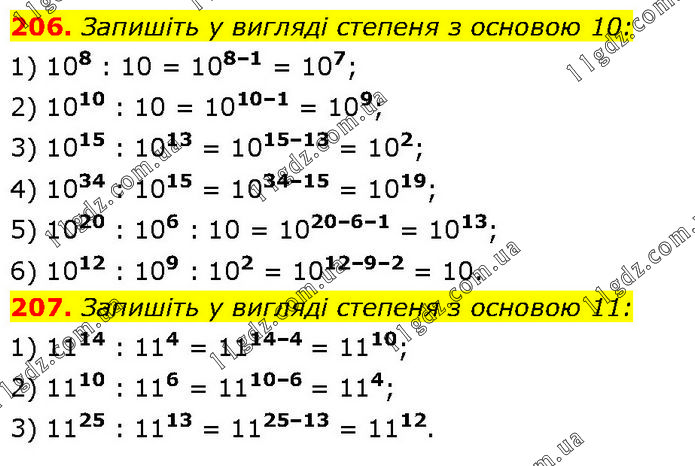 206. Запишіть у вигляді степеня з основою 10: 1) 108 : 10 = 108–1 = 107; 2) 1010 : 10 = 1010–1 = 109; 3) 1015 : 1013 = 1015–13 = 102; 4) 1034 : 1015 = 1034–15 = 1019; 5) 1020 : 106 : 10 = 1020–6–1 = 1013; 6) 1012 : 109 : 102 = 1012–9–2 = 10. 207. Запишіть у вигляді степеня з основою 11: 1) 1114 : 114 = 1114–4 = 1110; 2) 1110 : 116 = 1110–6 = 114; 3) 1125 : 1113 = 1125–13 = 1112.