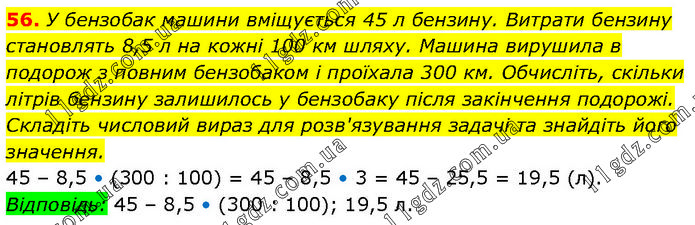 У бензобак машини вміщується 45 л бензину. Витрати бензину становлять 8,5 л на кожні 100 км шляху. Машина вирушила в подорож з повним бензобаком і проїхала 300 км. Обчисліть, скільки літрів бензину залишилось у бензобаку після закінчення подорожі. Складіть числовий вираз для розв'язування задачі та знайдіть його значення. 45 – 8,5 • (300 : 100) = 45 – 8,5 • 3 = 45 – 25,5 = 19,5 (л). Відповідь: 45 – 8,5 • (300 : 100); 19,5 л.