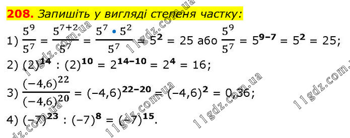 Запишіть у вигляді степеня частку: 1) 5^9/5^7 = 5^(7+2)/5^7 = (5^7 • 5^2)/5^7 = 52 = 25 або 5^9/5^7 = 59–7 = 52 = 25; 2) (2)14 : (2)10 = 214–10 = 24 = 16; 3) 〖(-4,6)〗^22/〖(-4,6)〗^20 = (–4,6)22–20 = (–4,6)2 = 0,36; 4) (–7)23 : (–7)8 = (–7)15.