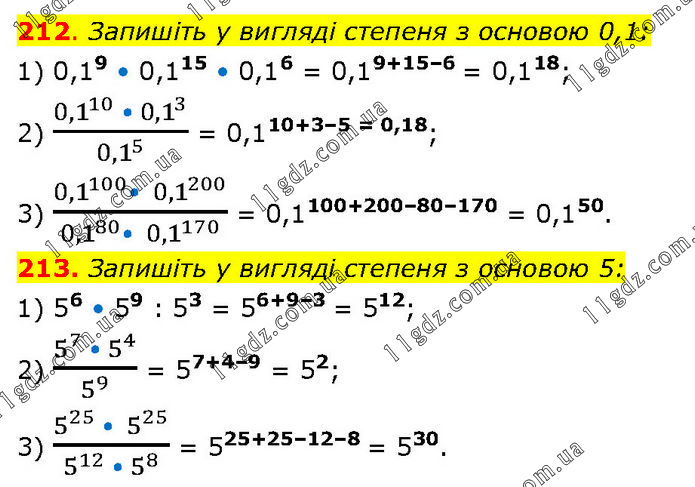 212. Запишіть у вигляді степеня з основою 0,1: 1) 0,19 • 0,115 • 0,16 = 0,19+15–6 = 0,118; 2) (〖0,1〗^10 • 〖0,1〗^3)/〖0,1〗^5 = 0,110+3–5 = 0,18; 3) (〖0,1〗^100• 〖0,1〗^200)/(〖0,1〗^80• 〖0,1〗^170 ) = 0,1100+200–80–170 = 0,150. 213. Запишіть у вигляді степеня з основою 5: 1) 56 • 59 : 53 = 56+9–3 = 512; 2) (5^7 • 5^4)/5^9 = 57+4–9 = 52; 3) (5^25 • 5^25)/(5^12 • 5^8 ) = 525+25–12–8 = 530.