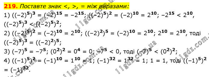 Поставте знак <, >, = між виразами: 1) ((–2)5)3 = (–2)15 = –215; ((–2)5)2 = (–2)10 = 210; –215 < 210, ((–2)5)3 < ((–2)5)2; 2) ((–2)5)2 = (–2)10 = 210; ((–2)2)5 = (–2)10 = 210; 210 = 210, тоді ((–2)5)3 = ((–2)2)5; 3) (–7)5 = –75; (02)2 = 04 = 0; –75 < 0, тоді (–7)5 < (02)2; 4) ((–1)5)2 = (–1)10 = 110 = 1; (–1)32 = 132 = 1; 1 = 1, тоді ((–1)5)2 = (–1)32.