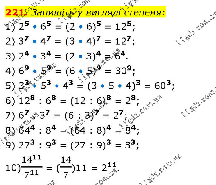 Запишіть у вигляді степеня: 1) 25 • 65 = (2 • 6)5 = 125; 2) З7 • 47 = (3 • 4)7 = 127; 3) 24 • З4 = (2 • З)4 = 64. 4) 69 • 59 = (6 • 5)9 = 309; 5) 33 • 53 • 43 = (3 • 5 • 4)3 = 603; 6) 128 : 68 = (12 : 6)8 = 28; 7) 67 : З7 = (6 : З)7 = 27; 8) 644 : 84 = (64 : 8)4 = 84; 9) 273 : 93 = (27 : 9)3 = З3; 10)14^11/7^11 = (14/7)11 = 211.
