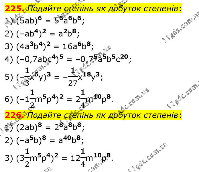 225. Подайте степінь як добуток степенів: 1) (5ab)6 = 56a6b6; 2) (–ab4)2 = a2b8; 3) (4a3b4)2 = 16a6b8; 4) (–0,7abс4)5 = –0,75a5b5с20; 5) (–1/3х6у)3 = –1/27х18у3; 6) (–11/2m5p4)2 = 21/4m10p8. 226. Подайте степінь як добуток степенів: 1) (2ab)8 = 28a8b8; 2) (–a5b)8 = a40b8; 3) (31/2m5p4)2 = 121/4m10p8.