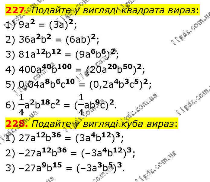 227. Подайте у вигляді квадрата вираз: 1) 9a2 = (3а)2; 2) 36a2b2 = (6аb)2; 3) 81a12b12 = (9a6b6)2; 4) 400a40b100 = (20a20b50)2; 5) 0,04a8b6c10 = (0,2a4b3c5)2; 6) 1/4a2b18c2 = (1/4ab9c)2. 228. Подайте у вигляді куба вираз: 1) 27a12b36 = (3a4b12)3; 2) –27a12b36 = (–3a4b12)3; 3) –27a9b15 = (–3a3b5)3.