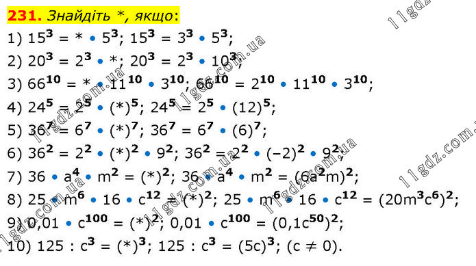 Знайдіть *, якщо: 1) 153 = * • 53; 153 = 33 • 53; 2) 203 = 23 • *; 203 = 23 • 103; 3) 6610 = * • 1110 • 310; 6610 = 210 • 1110 • 310; 4) 245 = 25 • (*)5; 245 = 25 • (12)5; 5) 367 = 67 • (*)7; 367 = 67 • (6)7; 6) 362 = 22 • (*)2 • 92; 362 = 22 • (–2)2 • 92; 7) 36 • a4 • m2 = (*)2; 36 • a4 • m2 = (6a2m)2; 8) 25 • m6 • 16 • c12 = (*)2; 25 • m6 • 16 • c12 = (20m3c6)2; 9) 0,01 • c100 = (*)2; 0,01 • c100 = (0,1c50)2; 10) 125 : c3 = (*)3; 125 : c3 = (5c)3; (c ≠ 0).