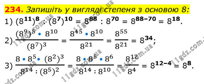 Запишіть у вигляді степеня з основою 8: 1) (811)8 : (87)10 = 888 : 870 = 888–70 = 818. 2) ((8^9 )^5 • 8^10)/(〖(8〗^7 )^3 ) = (8^45 • 8^10)/8^21 = 8^55/8^21 = 834; 3) (8 • 8^5• 〖(8〗^2 )^3)/(8^14 ∶ 〖(8〗^5 )^2 ) = (8 • 8^5 • 8^6)/(8^14 ∶ 8^10 ) = 8^12/8^4 = 812–4 = 88.