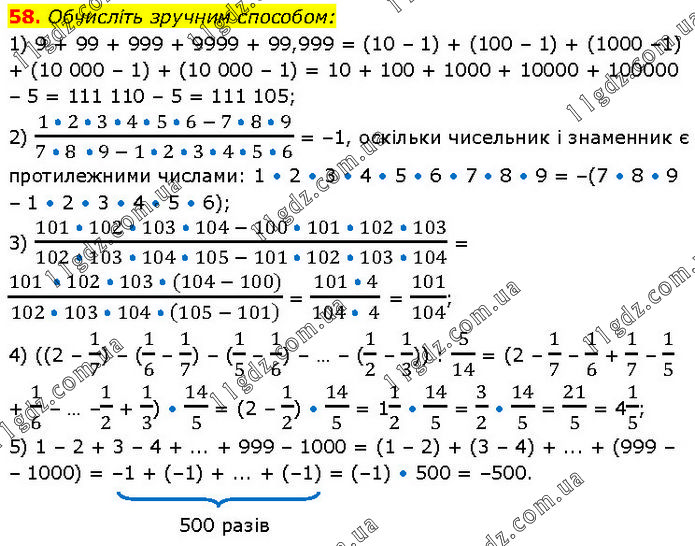 Обчисліть зручним способом: 1) 9 + 99 + 999 + 9999 + 99,999 = (10 – 1) + (100 – 1) + (1000 –1) + (10 000 – 1) + (10 000 – 1) = 10 + 100 + 1000 + 10000 + 100000 – 5 = 111 110 – 5 = 111 105; 2) (1 • 2 • 3 • 4 • 5 • 6 - 7 • 8 • 9)/(7 • 8 • 9 - 1 • 2 • 3 • 4 • 5 • 6) = –1, оскільки чисельник і знаменник є протилежними числами: 1 • 2 • 3 • 4 • 5 • 6 • 7 • 8 • 9 = –(7 • 8 • 9 – 1 • 2 • 3 • 4 • 5 • 6); 3) (101 • 102 • 103 • 104 - 100 • 101 • 102 • 103)/(102 • 103 • 104 • 105 - 101 • 102 • 103 • 104) = (101 • 102 • 103 • (104 - 100))/(102 • 103 • 104 • (105 - 101) ) = (101 • 4)/(104 • 4) = 101/104; 4) ((2 – 1/7) – (1/6 – 1/7) – (1/5 – 1/6) – … – (1/2 – 1/3)) : 5/14 = (2 – 1/7 – 1/6 + 1/7 – 1/5 + 1/6 – … –1/2 + 1/3) • 14/5 = (2 – 1/2) • 14/5 = 11/2 • 14/5 = 3/2 • 14/5 = 21/5 = 41/5; 5) 1 – 2 + 3 – 4 + ... + 999 – 1000 = (1 – 2) + (3 – 4) + ... + (999 – – 1000) = –1 + (–1) + ... + (–1) = (–1) • 500 = –500.