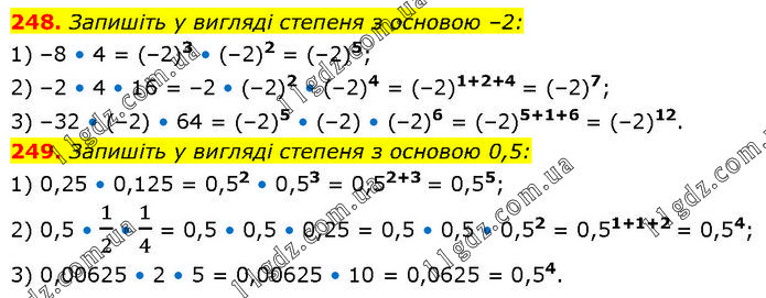 248. Запишіть у вигляді степеня з основою –2: 1) –8 • 4 = (–2)3 • (–2)2 = (–2)5; 2) –2 • 4 • 16 = –2 • (–2)2 • (–2)4 = (–2)1+2+4 = (–2)7; 3) –32 • (–2) • 64 = (–2)5 • (–2) • (–2)6 = (–2)5+1+6 = (–2)12. 249. Запишіть у вигляді степеня з основою 0,5: 1) 0,25 • 0,125 = 0,52 • 0,53 = 0,52+3 = 0,55; 2) 0,5 • 1/2 • 1/4 = 0,5 • 0,5 • 0,25 = 0,5 • 0,5 • 0,52 = 0,51+1+2 = 0,54; 3) 0,00625 • 2 • 5 = 0,00625 • 10 = 0,0625 = 0,54.