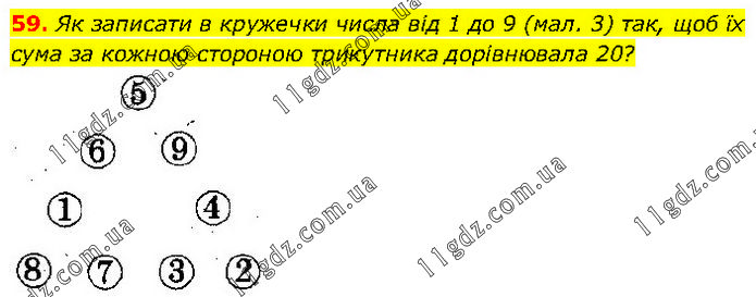 Як записати в кружечки числа від 1 до 9 (мал. 3) так, щоб їх сума за кожною стороною трикутника дорівнювала 20?