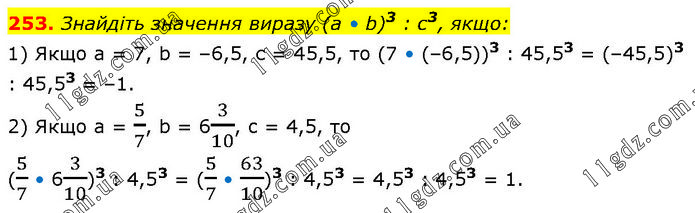 Знайдіть значення виразу (a • b)3 : с3, якщо: 1) Якщо а = 7, b = –6,5, с = 45,5, то (7 • (–6,5))3 : 45,53 = (–45,5)3 : 45,53 = –1. 2) Якщо а = 5/7, b = 63/10, c = 4,5, то (5/7 • 63/10)3 : 4,53 = (5/7 • 63/10)3 : 4,53 = 4,53 : 4,53 = 1.