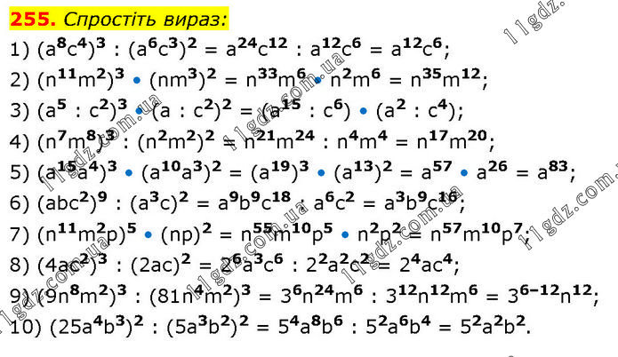 Спростіть вираз: 1) (a8с4)3 : (a6с3)2 = a24с12 : a12с6 = a12с6; 2) (n11m2)3 • (nm3)2 = n33m6 • n2m6 = n35m12; 3) (a5 : c2)3 • (a : c2)2 = (a15 : c6) • (a2 : c4); 4) (n7m8)3 : (n2m2)2 = n21m24 : n4m4 = n17m20; 5) (a15a4)3 • (a10a3)2 = (a19)3 • (a13)2 = a57 • a26 = a83; 6) (abс2)9 : (a3с)2 = a9b9с18 : a6с2 = a3b9с16; 7) (n11m2p)5 • (np)2 = n55m10p5 • n2p2 = n57m10p7; 8) (4aс2)3 : (2aс)2 = 26a3с6 : 22a2с2 = 24aс4; 9) (9n8m2)3 : (81n4m2)3 = 36n24m6 : 312n12m6 = 36–12n12; 10) (25a4b3)2 : (5a3b2)2 = 54a8b6 : 52a6b4 = 52a2b2.